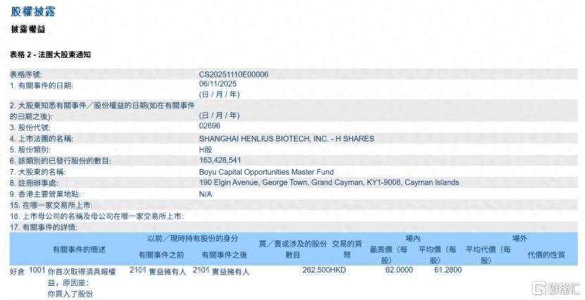 11月6日与11月10日,博裕资本(Boyu Capital Investment Management Limited)接连出手,分别买入复宏汉霖262,500股及80,000股H股,两次增持后其H股好仓比例由5.84%跃升至7%。